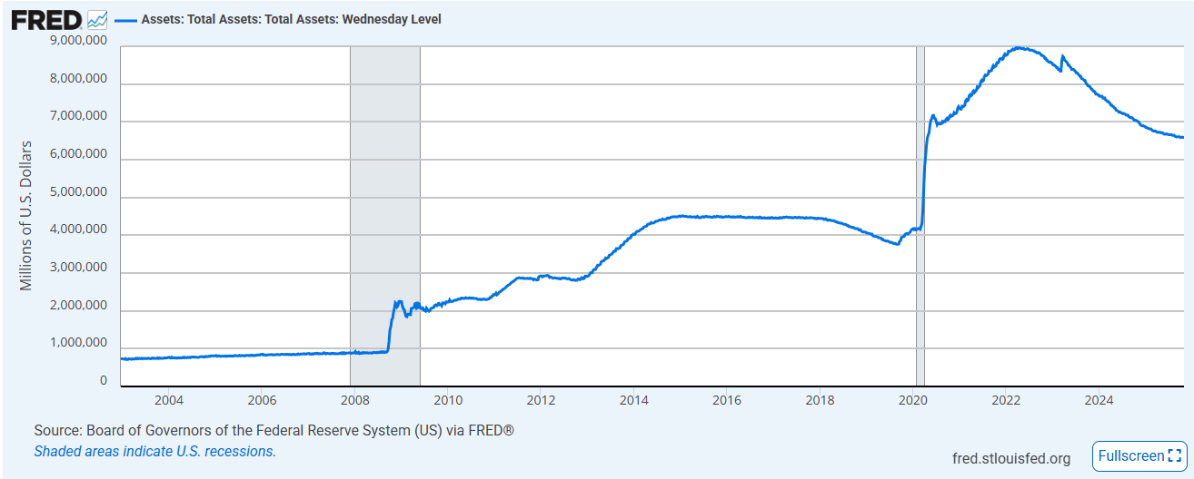 No cerne desta “super‑quarta” do FOMC (29 de outubro), o Fed sinalizou mudanças importantes: além do corte de 25 pontos‑base, o comitê anunciou o fim do programa de aperto quantitativo (QT), marcado para 1º de dezembro. O Fed acumulou 50 bps de afrouxamento em 2025 e agora classifica sua política como “moderadamente restritiva”, próxima do nível neutro. O fim do QT — e a transição para um balanço mais estável — sugere que a economia pode contar com maior liquidez a partir de 2026. Valores da política monetária foram calibrados com a justificativa de que os riscos no mercado de trabalho aumentaram, mesmo com a inflação ainda acima da meta de 2%.