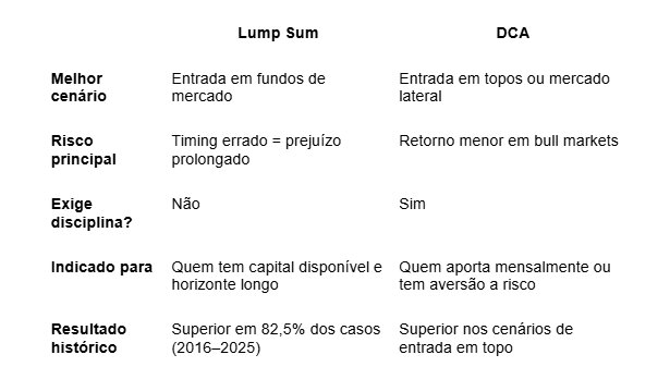 Lump sum significa investir todo o capital disponível de uma vez. É a abordagem mais simples: você tem um valor e o aloca integralmente em um único momento.