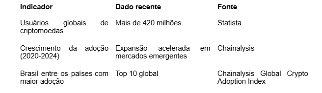 Os dados disponíveis indicam crescimento contínuo da adoção de criptomoedas, o que aumenta proporcionalmente à complexidade da gestão documental. No entanto, ainda há limitações na padronização global e na integração entre plataformas, o que exige soluções práticas e adaptáveis.