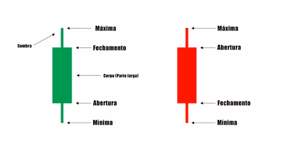 Todas essas informações formam o corpo e a sombra. O corpo é a parte mais larga da vela e mostra o fechamento e abertura no período selecionado, enquanto a sombra representa valores máximos e mínimos.