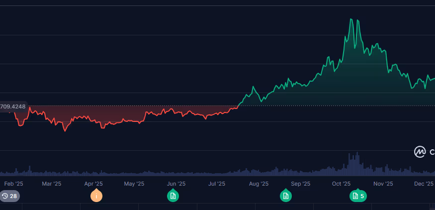 Após o pico, o ativo passou por uma correção natural, estabilizando-se na faixa entre US$ 600 e US$ 650 no final do ano um patamar ainda bem acima do observado no início de 2025, quando o token era negociado próximo a US$ 320–350.