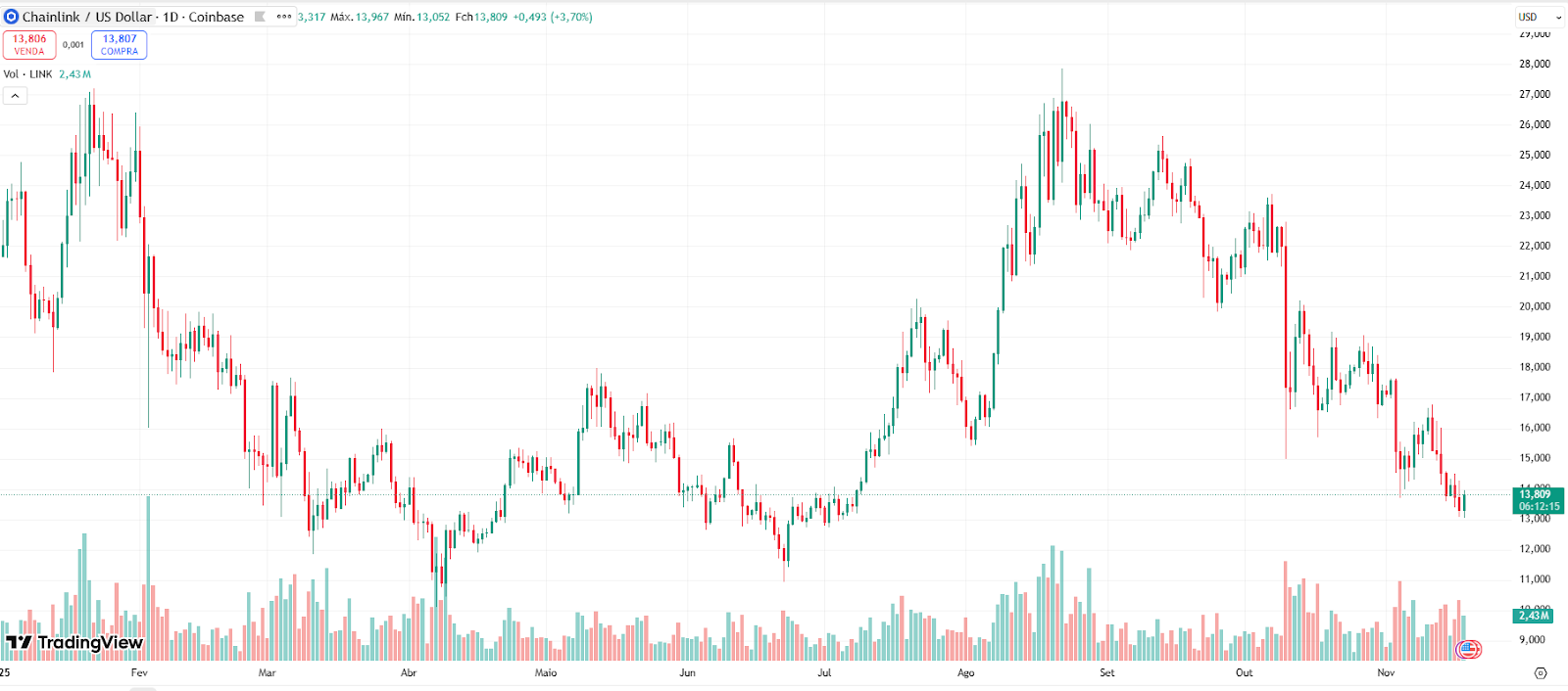 O desempenho da Chainlink (LINK) ao longo de 2025 foi marcado por forte volatilidade, com oscilações expressivas que refletiram tanto a instabilidade macroeconômica quanto os ciclos internos do mercado de criptomoedas. Logo no início do ano, o LINK continuou a correção iniciada no fim de 2024, registrando quedas acentuadas durante o primeiro trimestre. Esse movimento foi seguido por um longo período de consolidação entre abril e julho, quando o preço oscilou em uma faixa estreita, indicando incerteza entre compradores e vendedores.