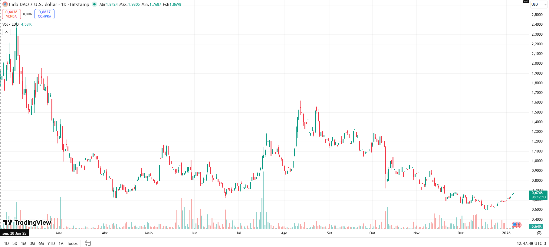 Ao longo de 2025, a Lido Finance apresentou um desempenho de preço mais contido em comparação a outros ativos do mercado cripto. Enquanto o setor como um todo passou por períodos de maior volatilidade e movimentos direcionais, o LDO permaneceu majoritariamente em consolidação, refletindo um mercado mais seletivo e menos orientado por especulação.