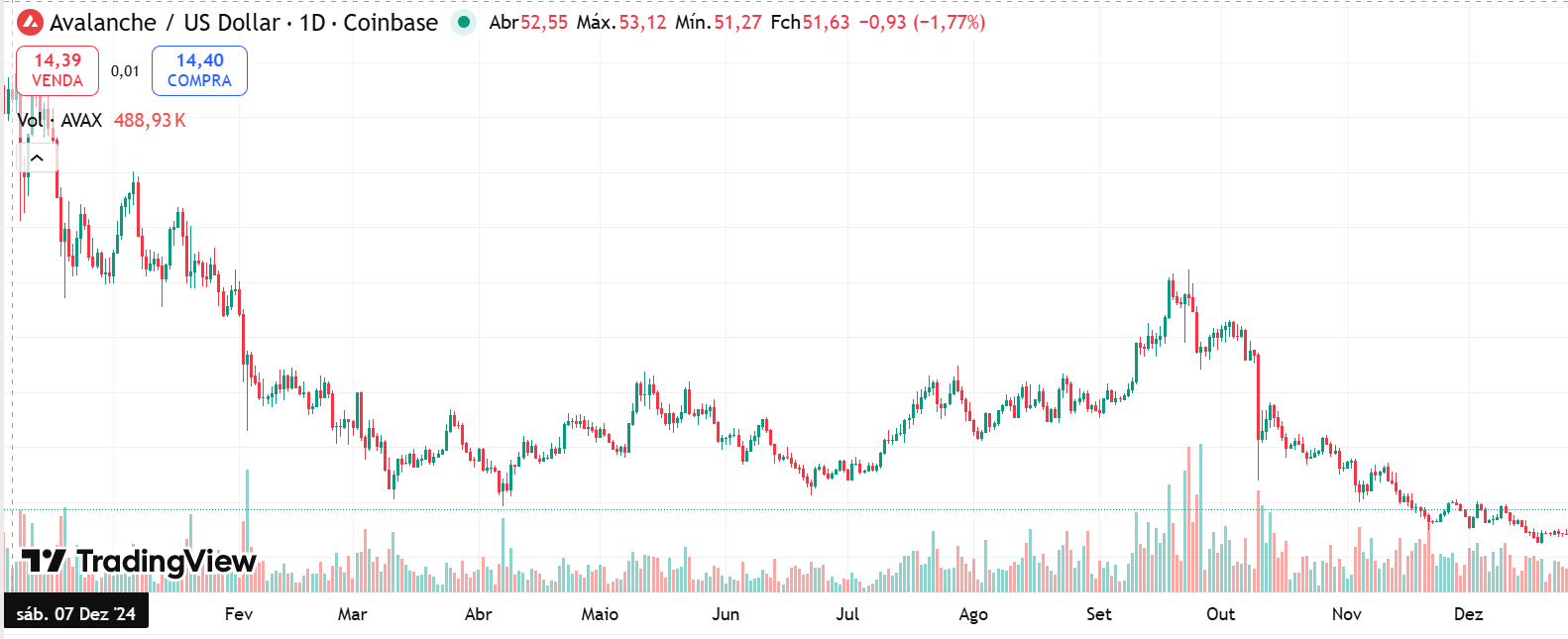 Ao longo de 2025, a Avalanche (AVAX) passou por um ano marcado por volatilidade elevada e por uma clara fase de consolidação após os excessos de ciclos anteriores. Do ponto de vista gráfico, o ativo iniciou o ano pressionado por uma tendência de baixa herdada do final de 2024, com sucessivas máximas e mínimas descendentes. Mesmo com tentativas de recuperação ao longo do primeiro semestre, o preço encontrou dificuldades para sustentar movimentos acima de zonas de resistência relevantes, o que manteve o AVAX negociando em um intervalo mais estreito durante boa parte do ano.