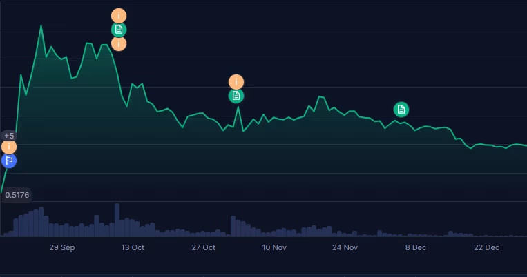 No entanto, a partir da segunda quinzena de outubro, o ativo passou a enfrentar um movimento de correção. O gráfico revela uma tendência de queda gradual, intercalada por breves repiques técnicos. Esse comportamento é comum em tokens lançados recentemente, principalmente quando há realização de lucros por investidores iniciais e arrefecimento do hype.