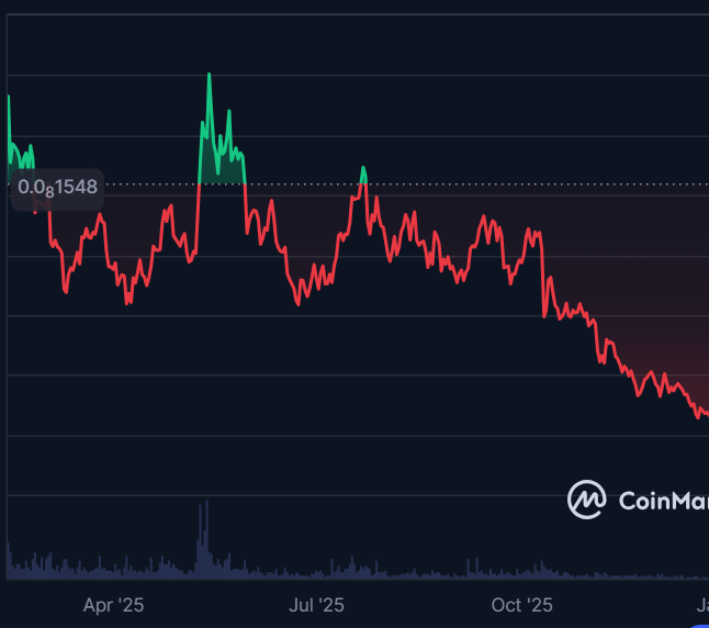 No último trimestre de 2025, a situação se agravou: o gráfico mostra uma aceleração na desvalorização, com o preço atingindo patamares ainda mais baixos em relação ao início do ano. Isso pode estar ligado a um contexto de baixa no mercado cripto em geral, aliado à ausência de entregas significativas por parte da equipe do projeto ou à saturação do ciclo de hype em torno das memecoins.