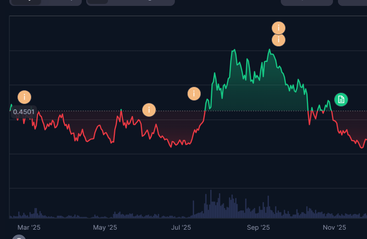 O ENA iniciou o ano sendo negociado próximo a US$ 0,45, mas enfrentou um longo período de queda e lateralização, com o preço oscilando de forma limitada e sem força para romper resistências significativas. Essa fase sugere um período de baixa confiança do mercado, possivelmente devido a incertezas sobre a sustentabilidade do protocolo ou a falta de catalisadores positivos no setor DeFi.