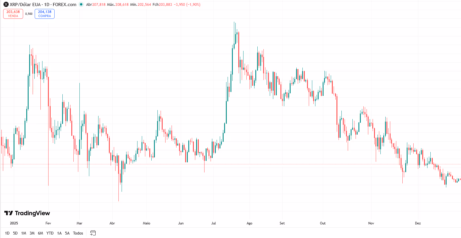 O Ripple (XRP) encerrou 2025 com um desempenho misto, refletindo a combinação entre avanços institucionais da Ripple Labs e um cenário macroeconômico global incerto. No gráfico diário, o ativo apresentou forte volatilidade nos primeiros meses do ano, chegando a superar brevemente a região de US$ 0,21, mas enfrentando dificuldade para sustentar o movimento.