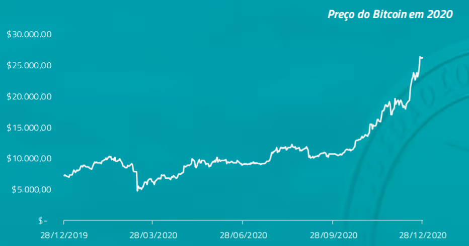 Um ano em que o BTC valorizou mais de 320%, chegou a valer menos de 4.000 USD (com uma queda de mais de 50% em seu valor no início do ano), e termina com o ativo chegando a mais de 30.000 USD de valor.