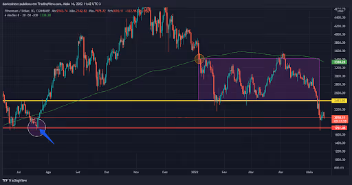 Analisando graficamente, a criptomoeda da rede Ethereum perdeu uma região de atuação de preços que o ativo vinha atuando, entre US$3.400 (R$17 mil) e US$2.400 (R$12 mil) e neste momento vem atuando próximo do suporte dos US$1.700 (R$8500), representado pela linha vermelha, onde foi registrado o fundo do ETH em julho do ano passado.