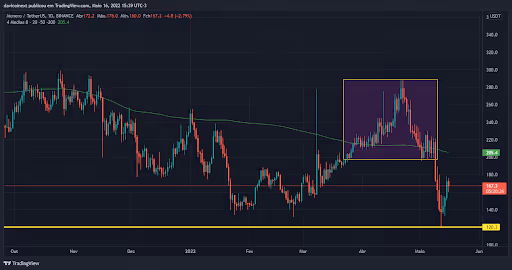 Durante este período de alta, a XMR chegou a romper a resistência na média móvel de 200 dias no gráfico e a tendência era da criptomoeda se manter acima desta média, devido ao aumento de sua demanda no mercado. No entanto, aconteceu a quebra de duas criptomoedas importantes do mercado, LUNA e UST, da Terra, o que acabou fazendo o mercado despencar, e com a XMR não foi diferente.