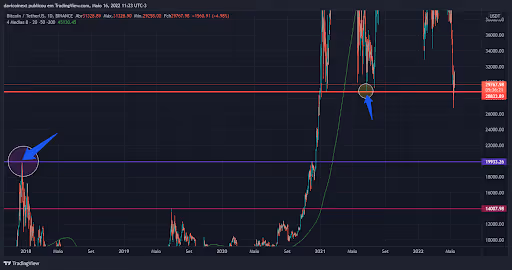 Existe a possibilidade de rompimento desta região de suporte e o Bitcoin buscar a região do penúltimo topo histórico da criptomoeda, que foi atingido na alta de 2017, ao redor dos US$20 mil (R$101 mil), linha lilás no gráfico abaixo.
