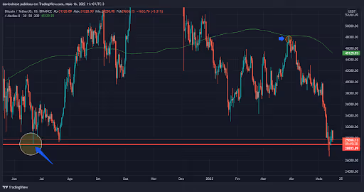 Em relação ao gráfico, o Bitcoin está atuando próximo de uma região de suporte importante, ao redor dos US$28.800 (R$145 mil), que foi o preço mais baixo da criptomoeda no ano passado e se torna uma região importante de suporte neste momento.