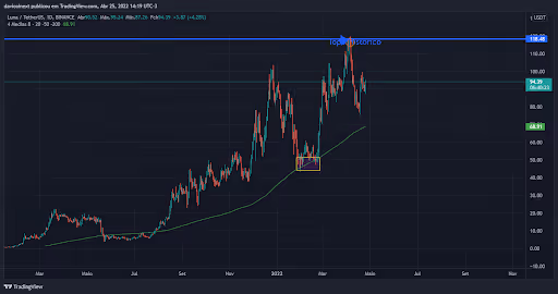 Durante este longo período de alta, a LUNA vem atuando acima da média móvel de 200 dias (Linha Verde), e caso esta tendência de alta continue, a criptomoeda pode buscar novamente sua alta histórica acima dos US$ 118 (R$566), o que seria a principal resistência da LUNA neste momento, representada pela linha azul no gráfico.
