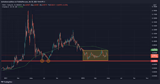 A Tron vem passando por um longo período de lateralização em 2022. A criptomoeda vem atuando na faixa de preços entre US$0,048 (R$0,23) e US$0,077 (R$0,37), que está representada pelo caixote amarelo. Analisando o gráfico, esta faixa de preços está localizada entre a região de resistência (Linha Verde) que seria a média móvel de 200 dias e a região de suporte (Linha Vermelha) que representa o valor mais baixo da TRX desde julho do ano passado.