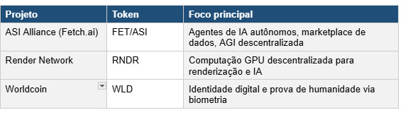 Em resumo: RNDR é infraestrutura de computação, WLD é identidade digital, e ASI é o ecossistema mais completo de IA descentralizada — cobrindo desde dados até agentes e pesquisa em AGI.