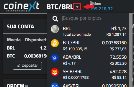 No site da Coinext, escolha a criptomoeda que deseja negociar clicando na lista suspensa ao lado da marca “Coinext”.