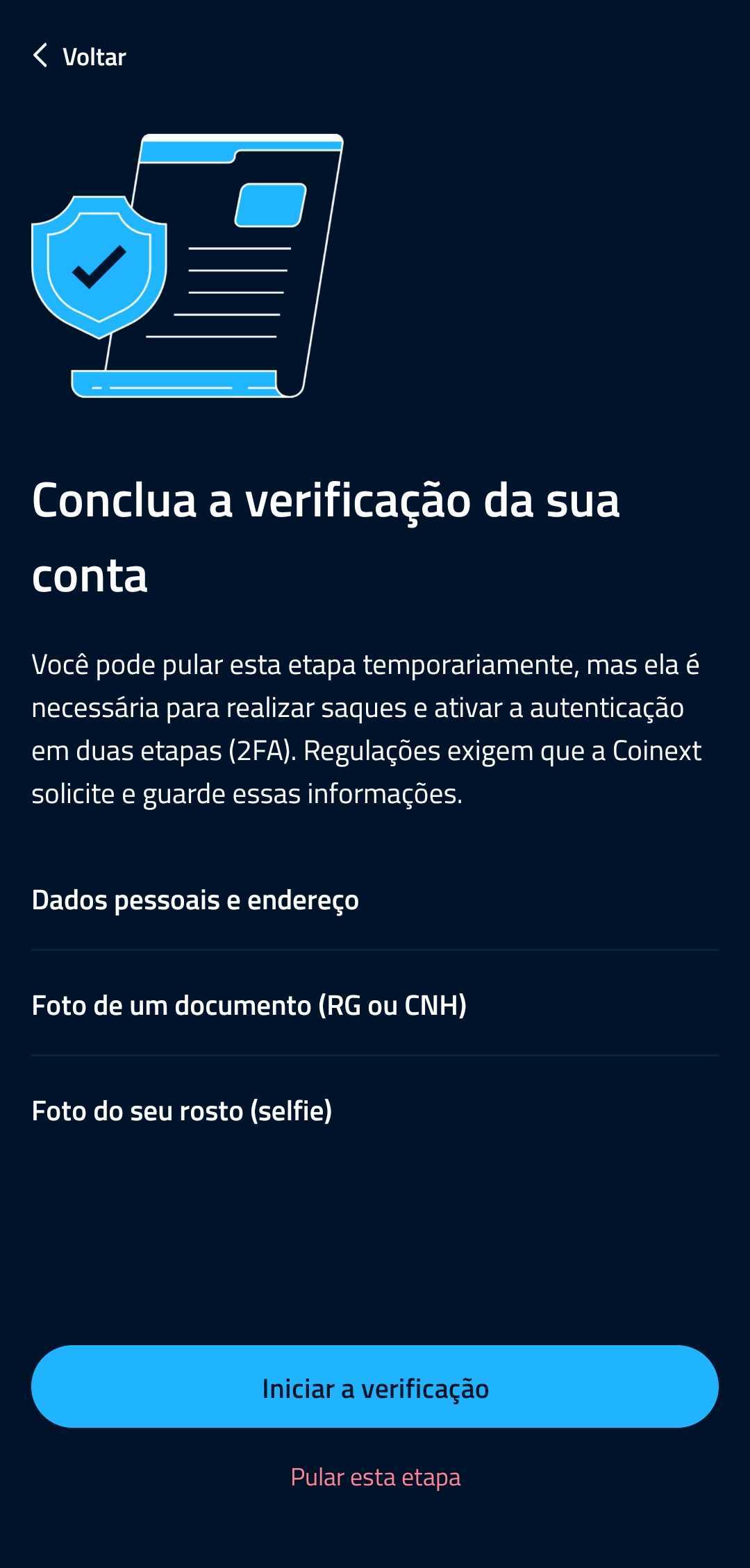No momento a verificação de conta só pode ser realizada pelo aplicativo da Coinext, disponível na App Store e Google Play, a verificação deve ser feita acessar o App > Ajustes > Verificar conta/Meus limites: